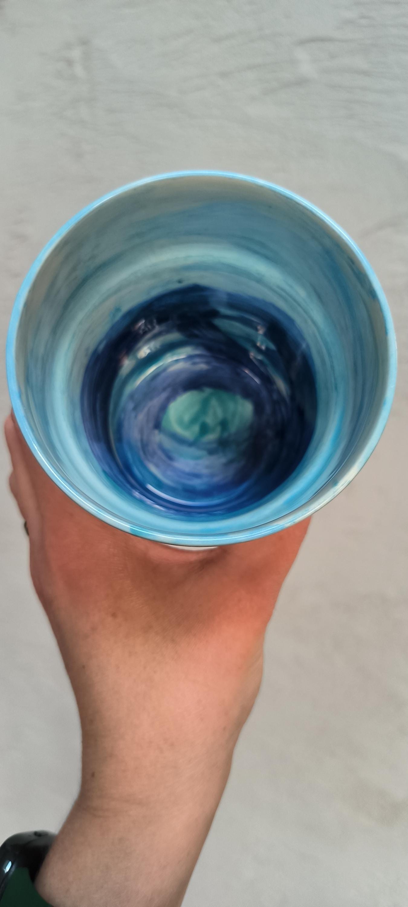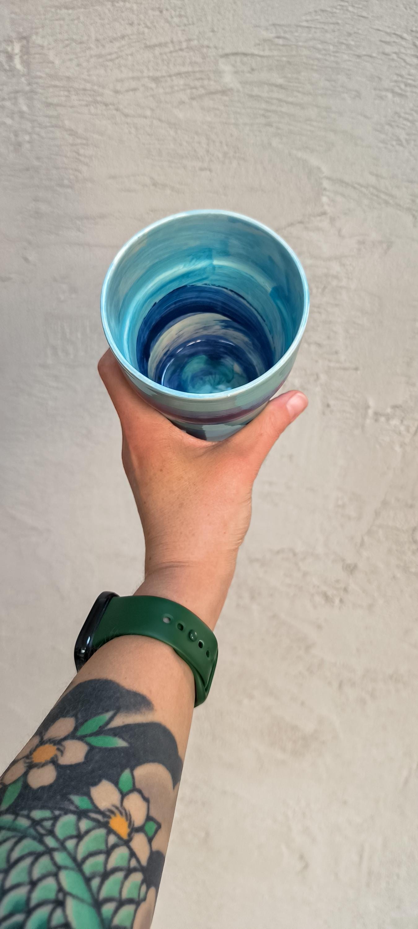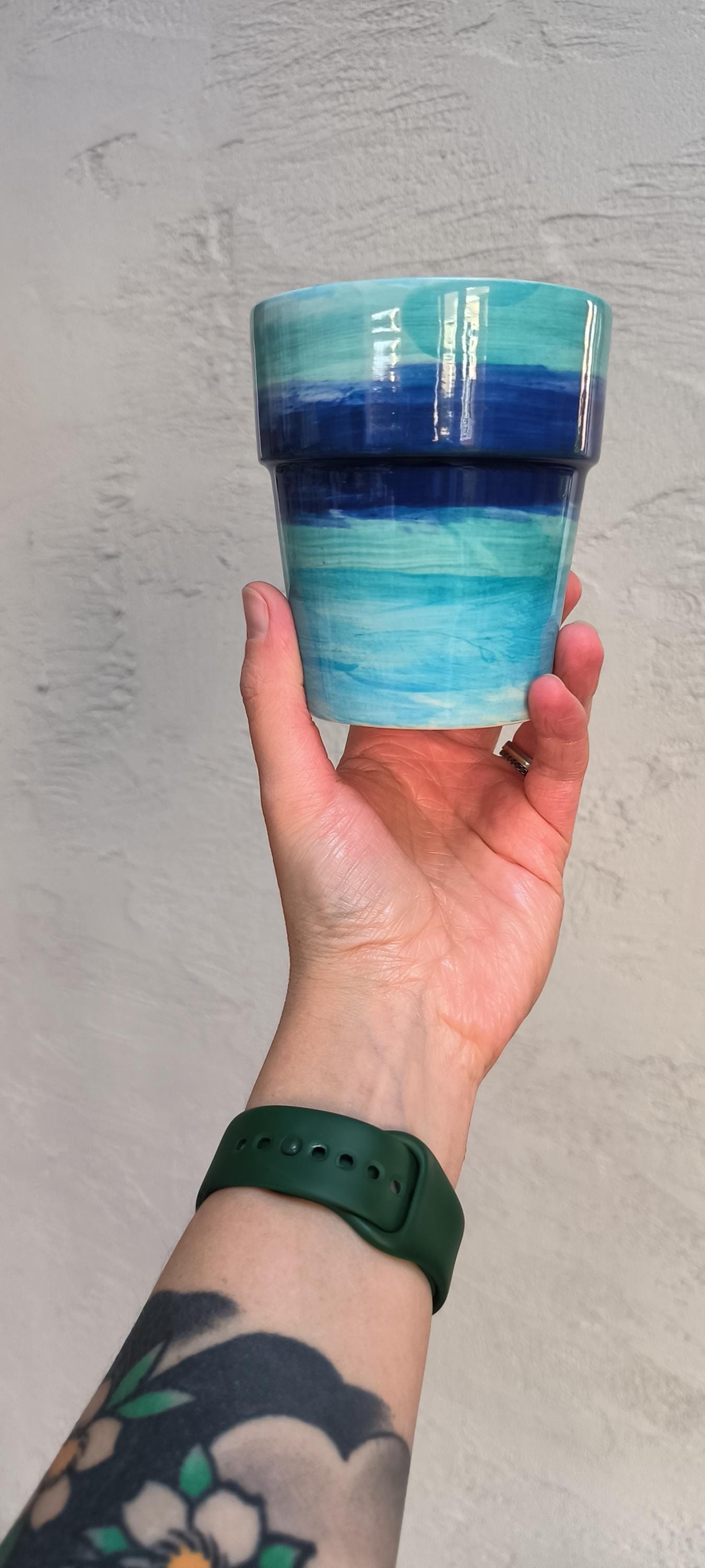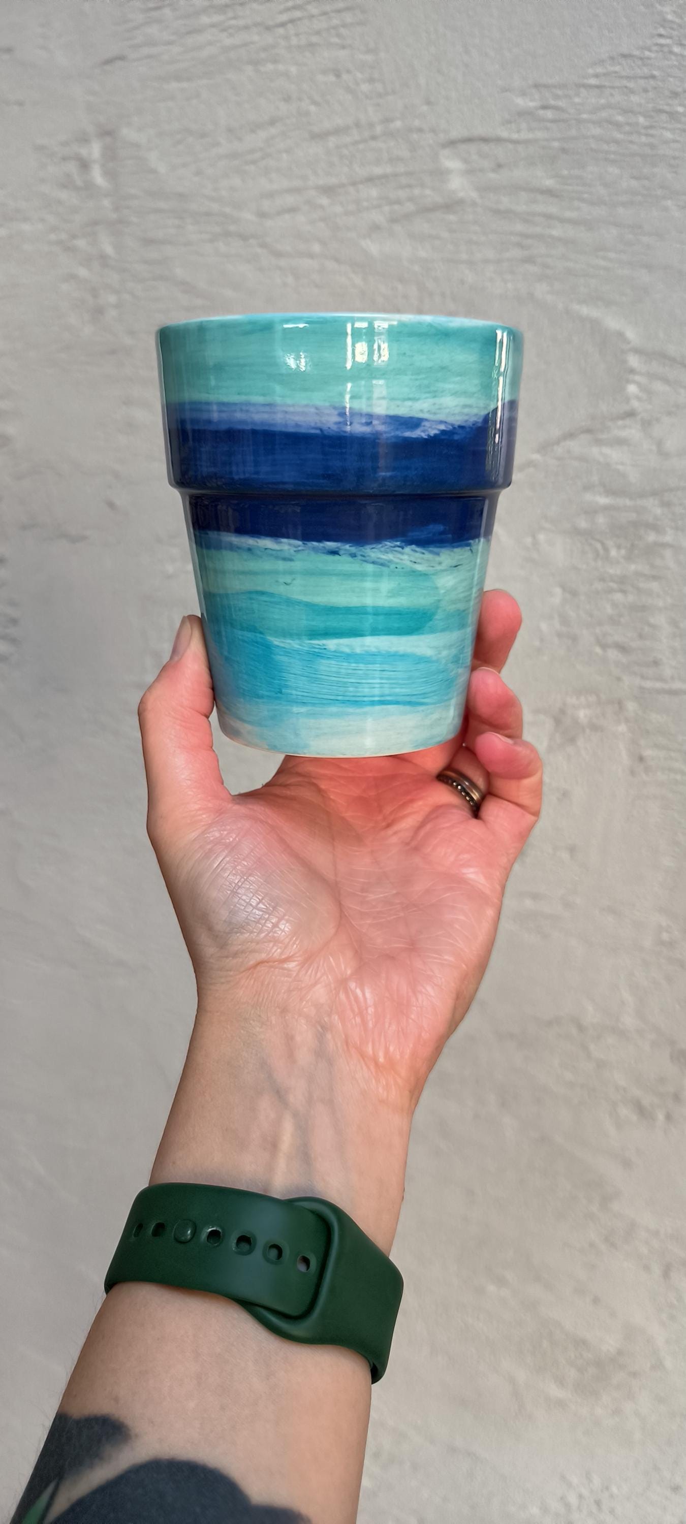 This one-of-a-kind ceramic mug was handcrafted in my studio and inspired by my recent holiday in Sicily — the endless blues of the Mediterranean Sea, sun-washed coastlines, and the calm rhythm of island life.