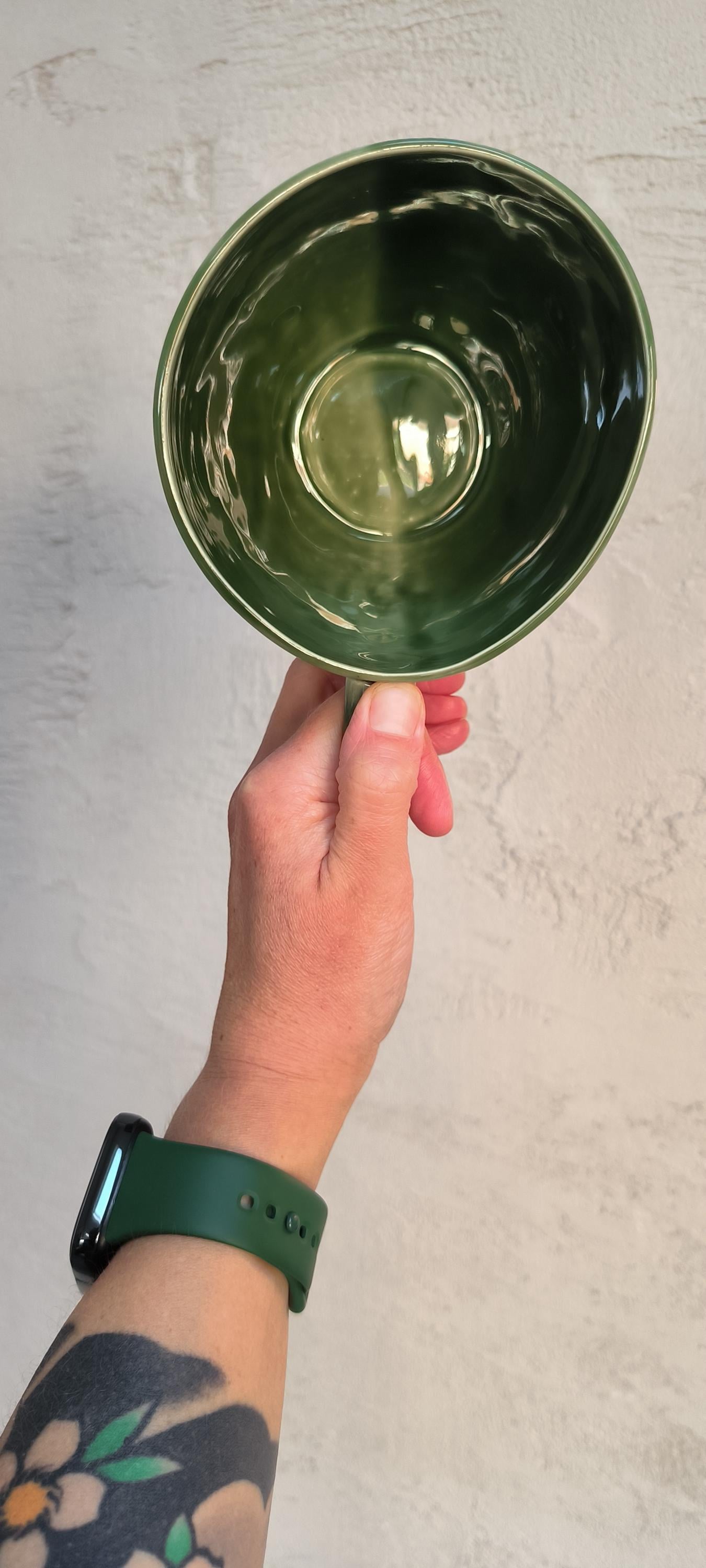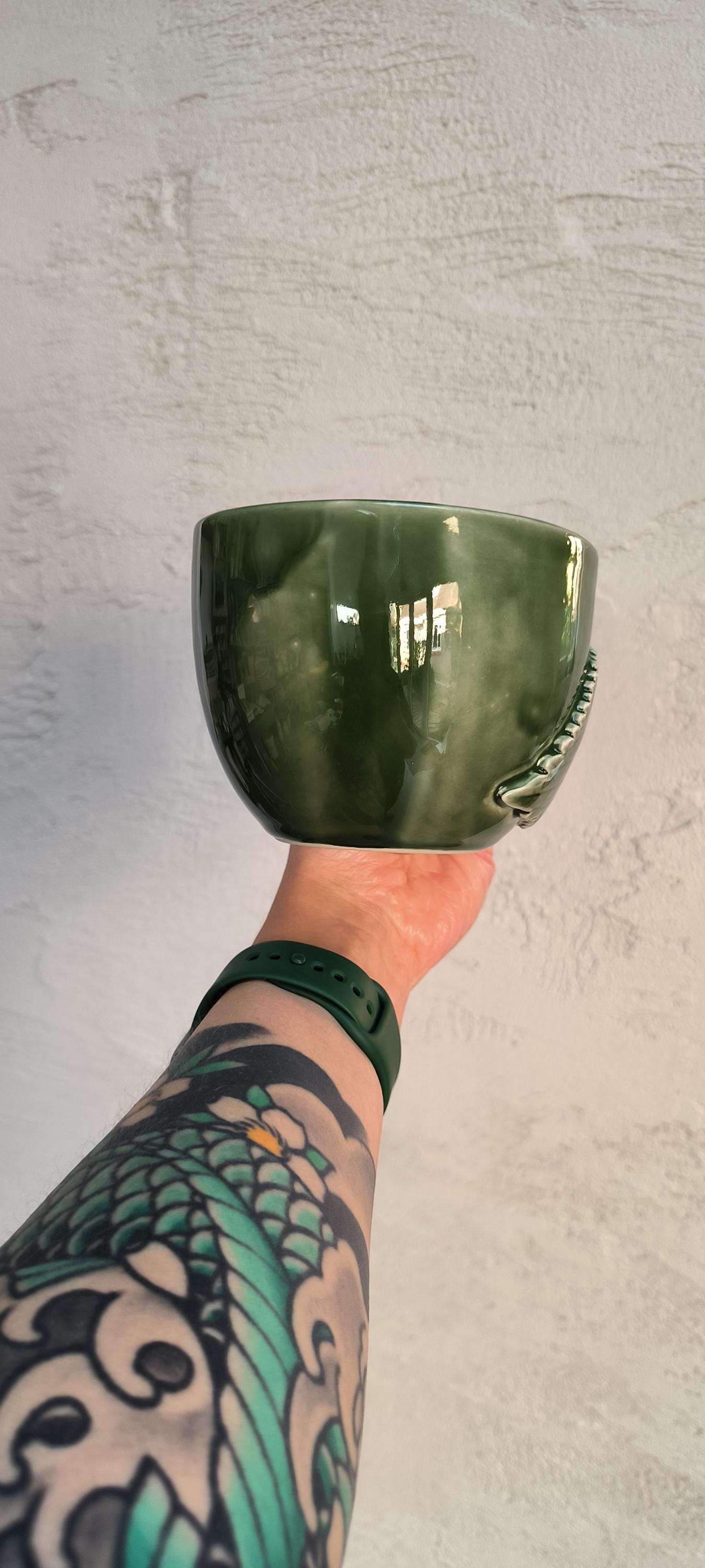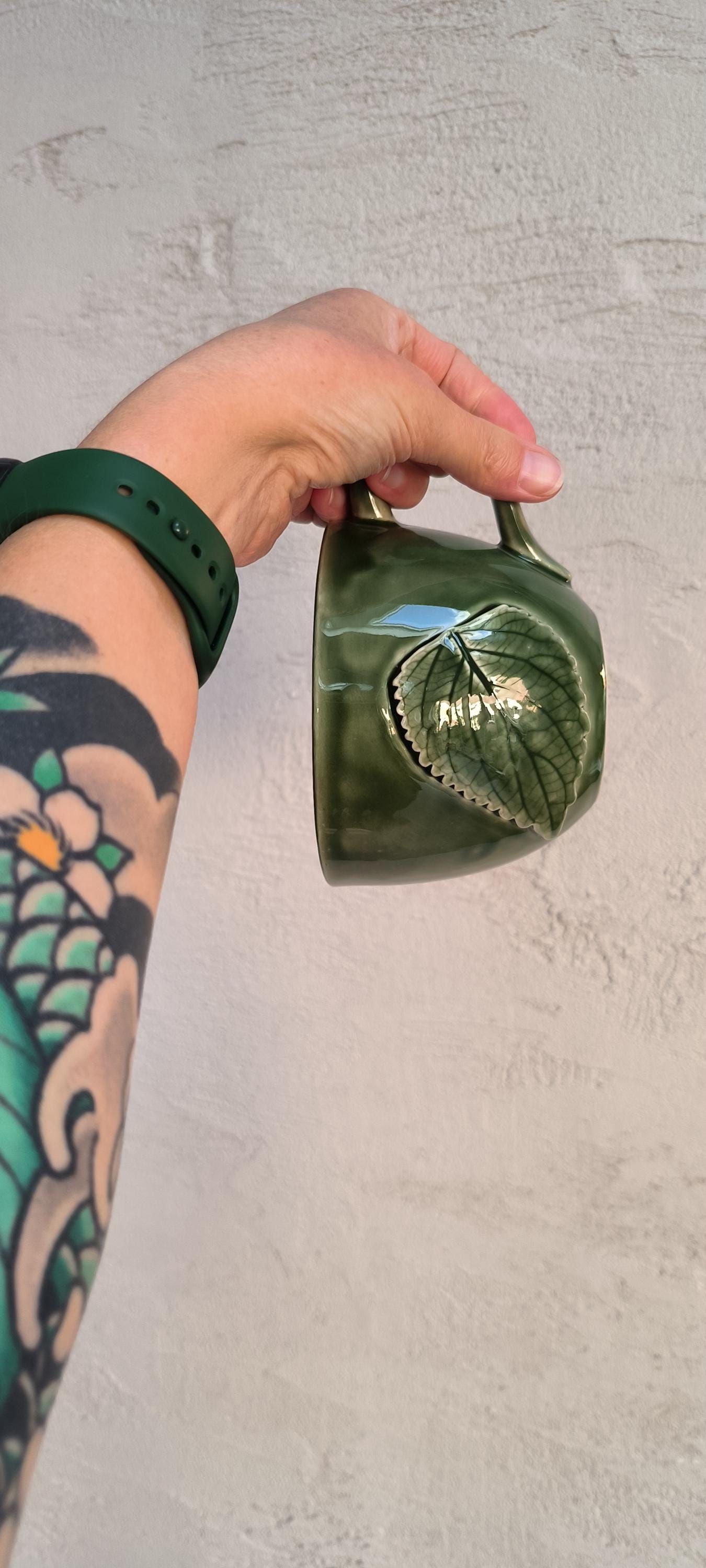 Wrap your hands around something truly special. This fully handmade ceramic mug is crafted in my little pottery studio with love, care, and a touch of nature’s magic. Finished in a deep British green glaze, the surface flows beautifully around a hand-sculpted leaf, giving the mug a grounded, organic feel.