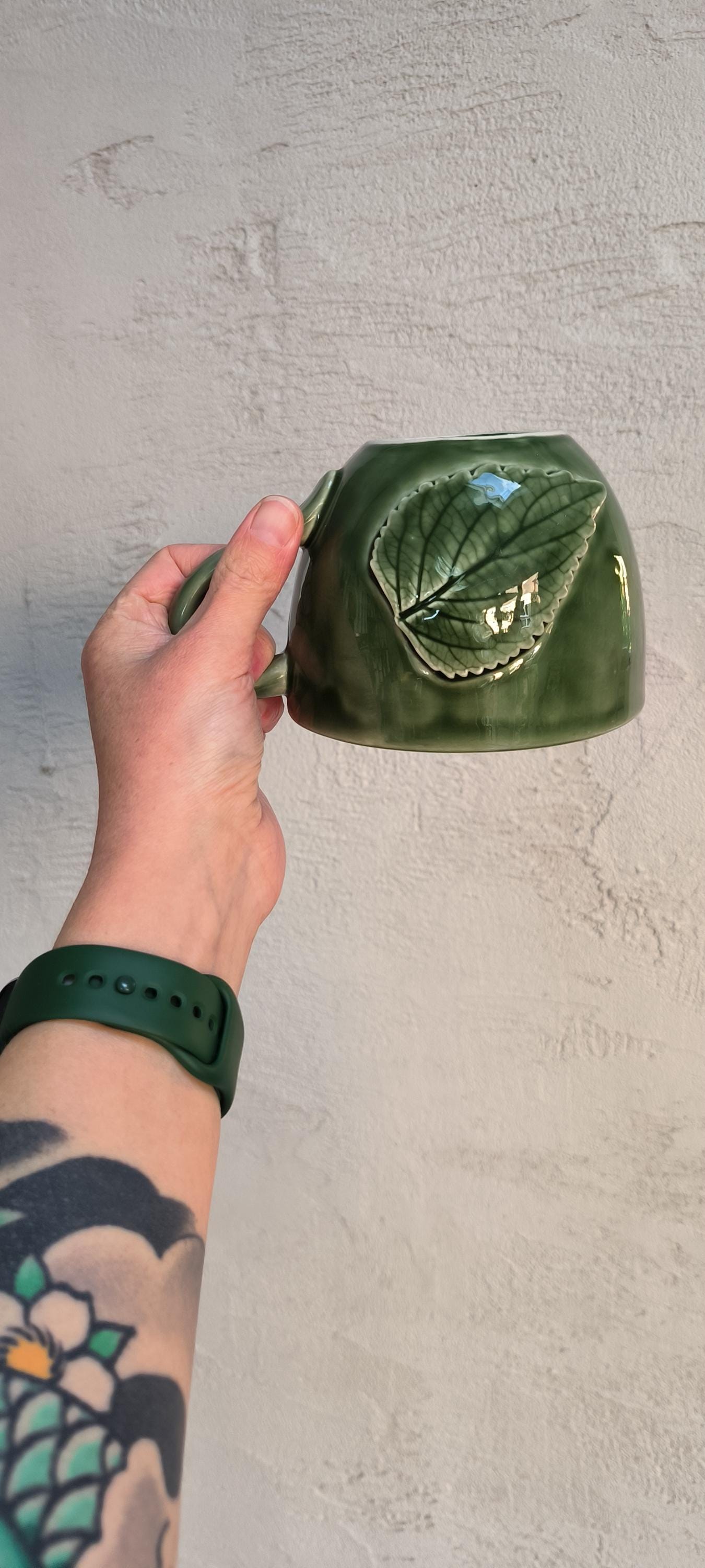 Handmade British Green Ceramic Mug with coleus Leaf – Large 600ml Pottery Cup, Nature Inspired Gift, Big Tea Coffee Mug