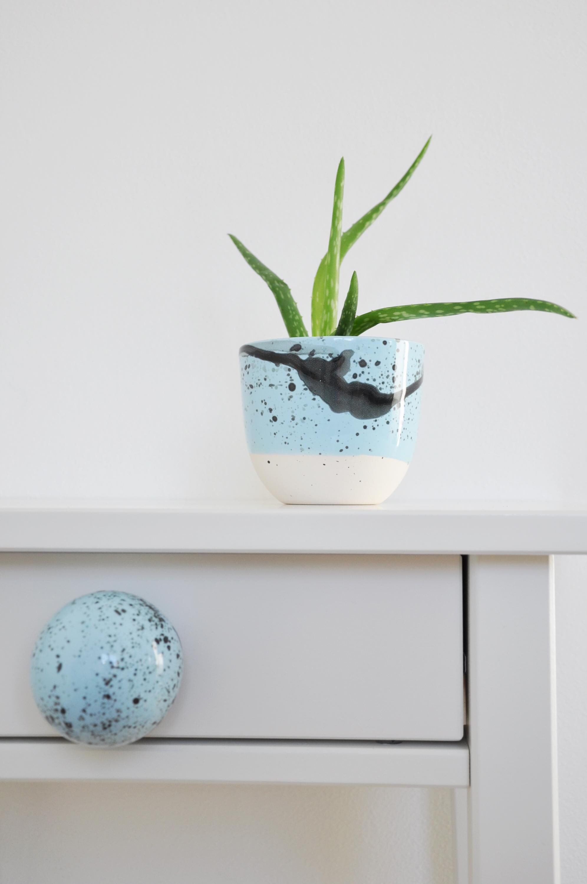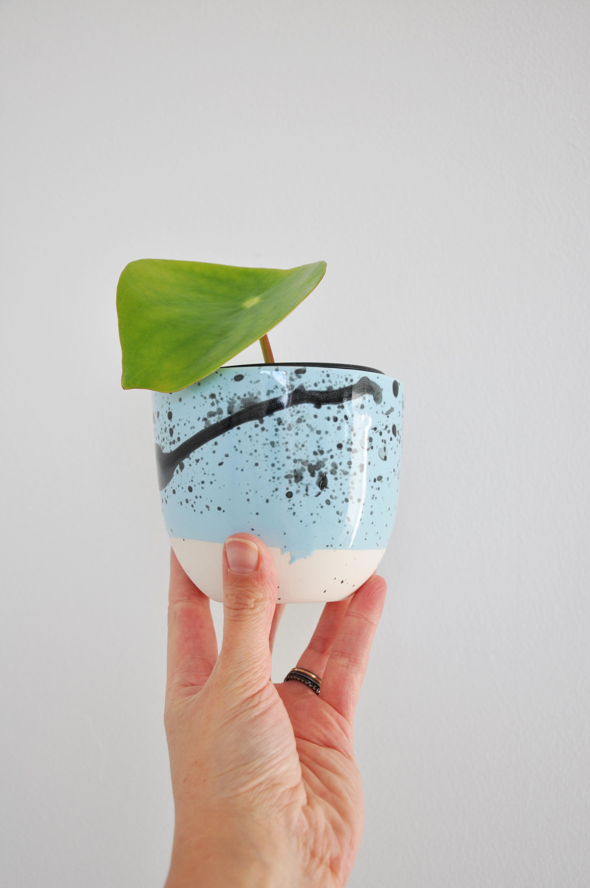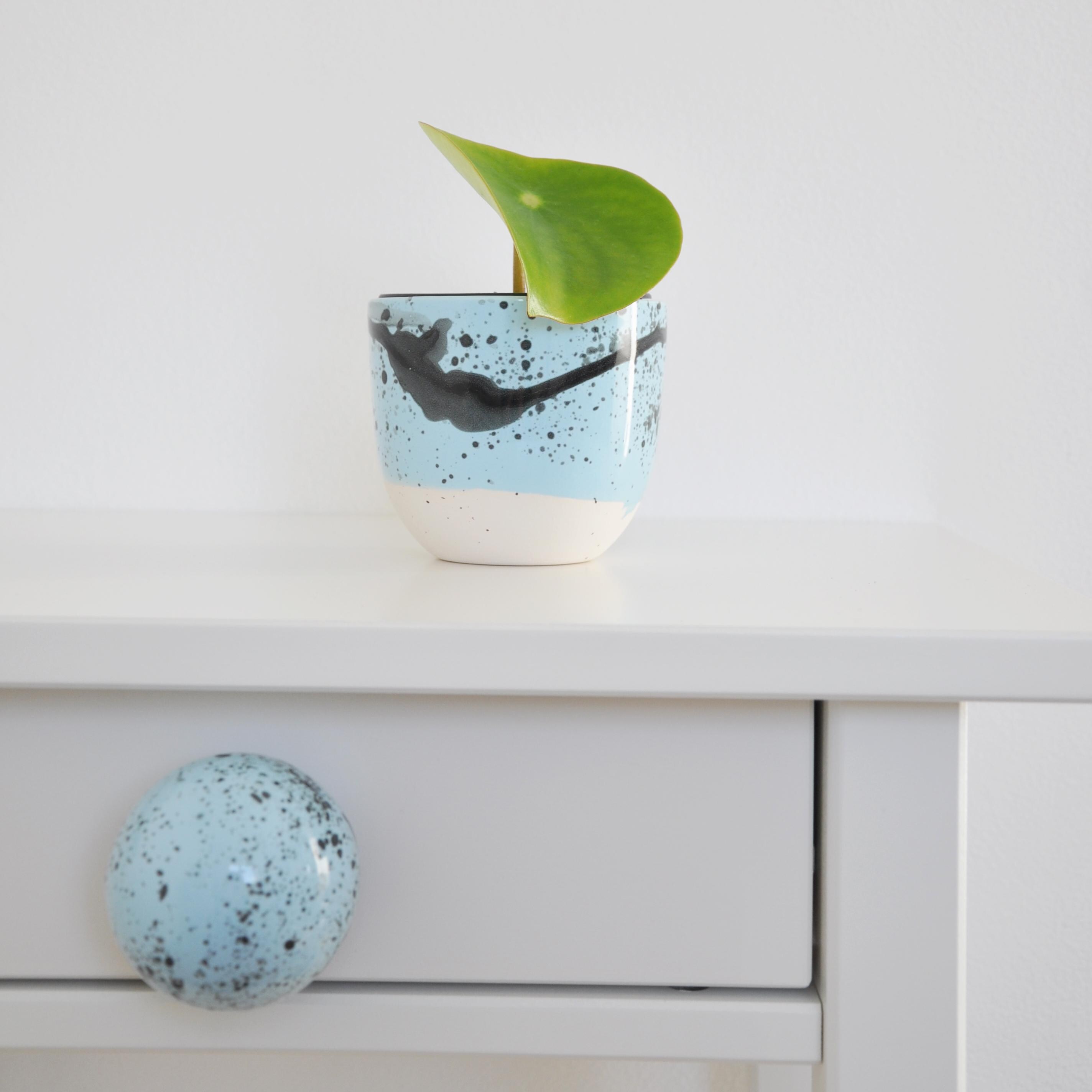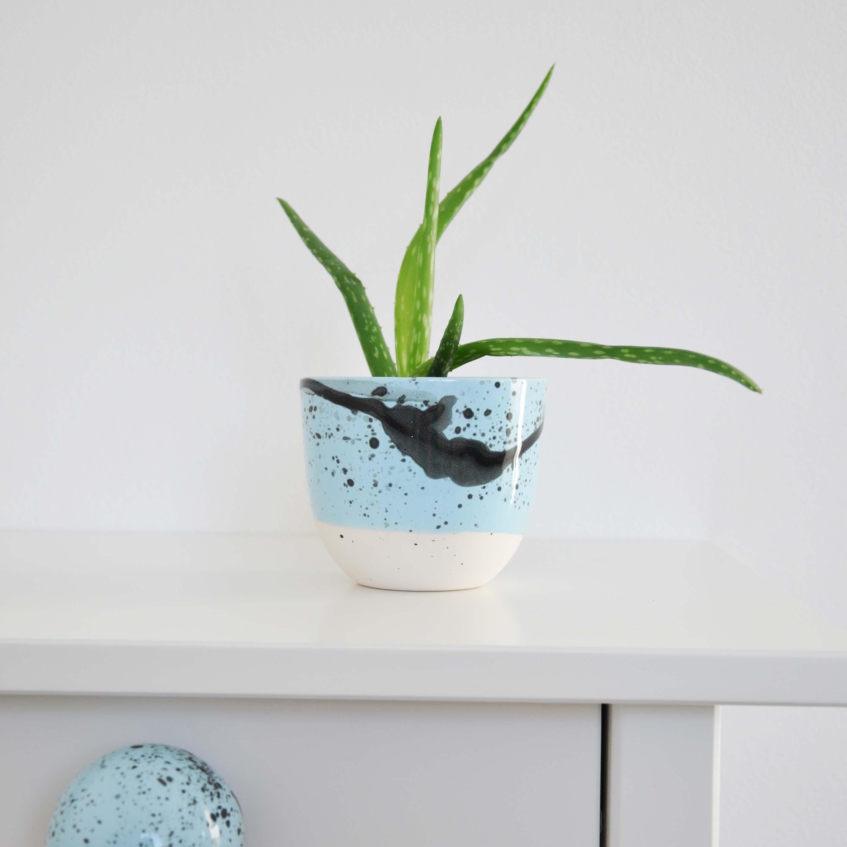 Bring a touch of handmade charm to your home with this small ceramic planter, crafted from low-fire slip clay and fired at 1080°C for strength and durability. It features a glossy light blue glaze with artistic black splashes, applied on part of the surface for a striking, modern contrast.