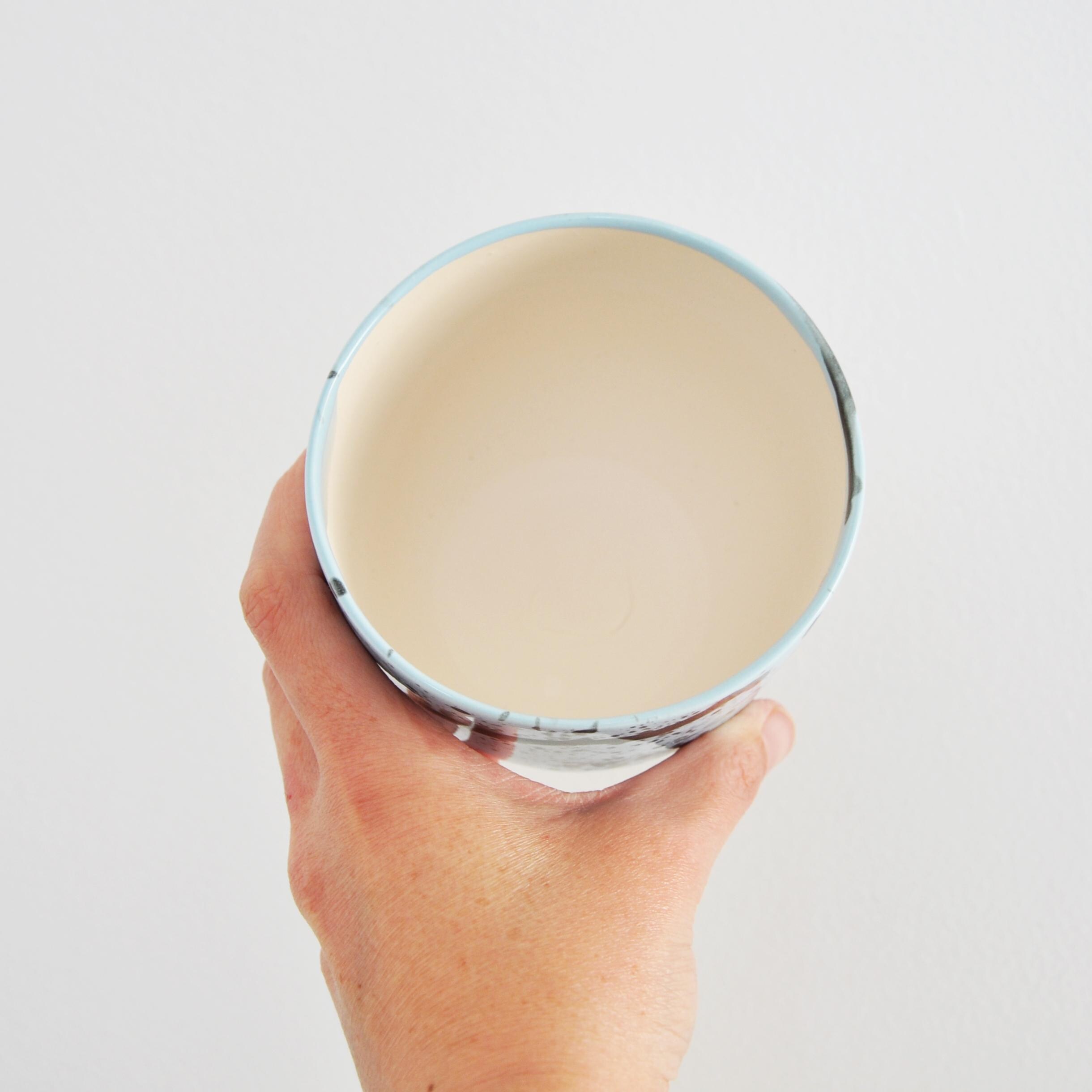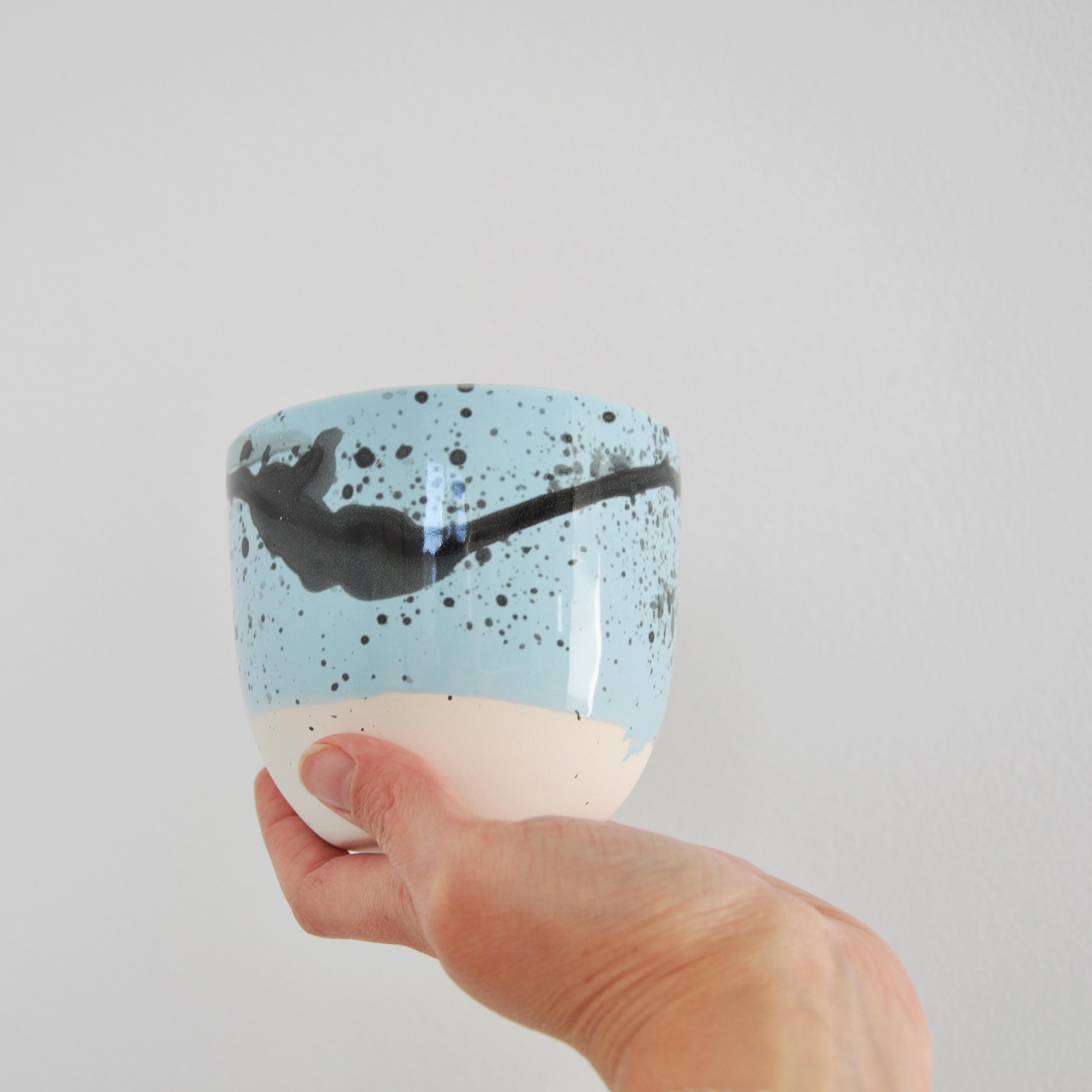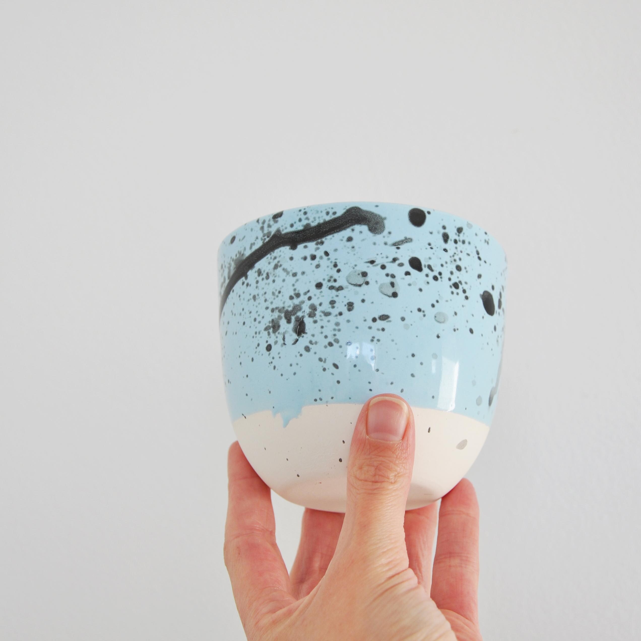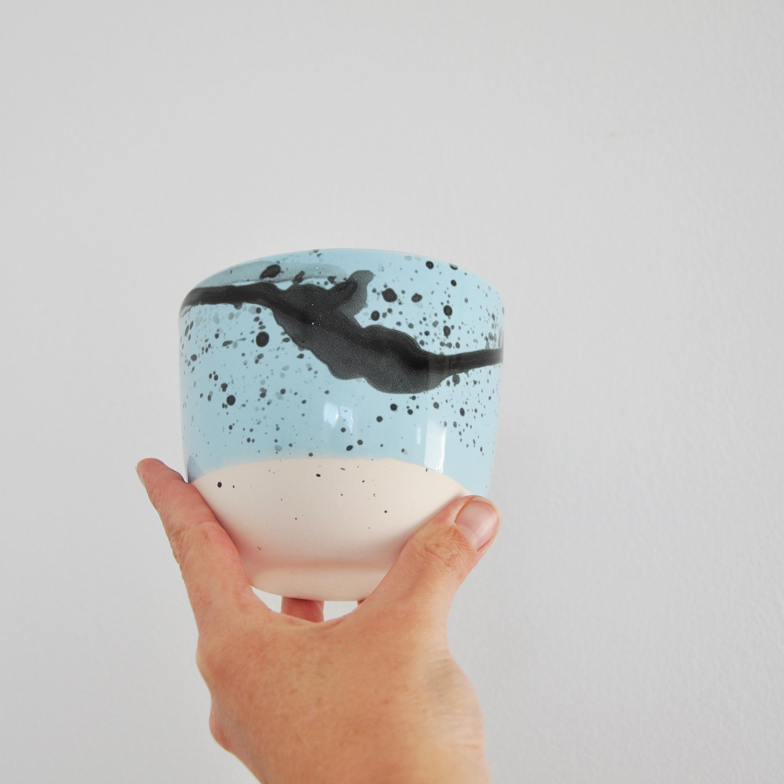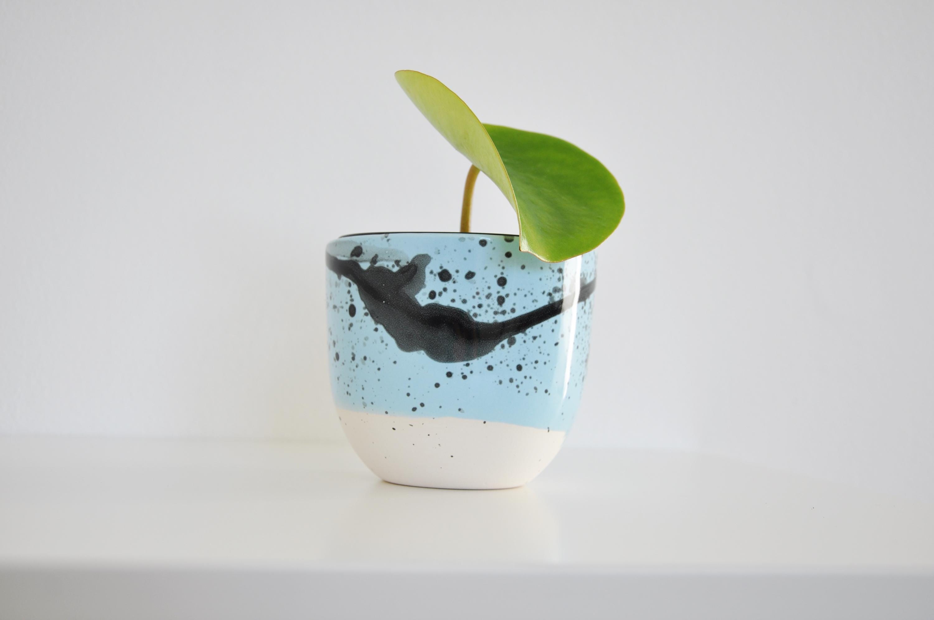 Bring a touch of handmade charm to your home with this small ceramic planter, crafted from low-fire slip clay and fired at 1080°C for strength and durability. It features a glossy light blue glaze with artistic black splashes, applied on part of the surface for a striking, modern contrast.