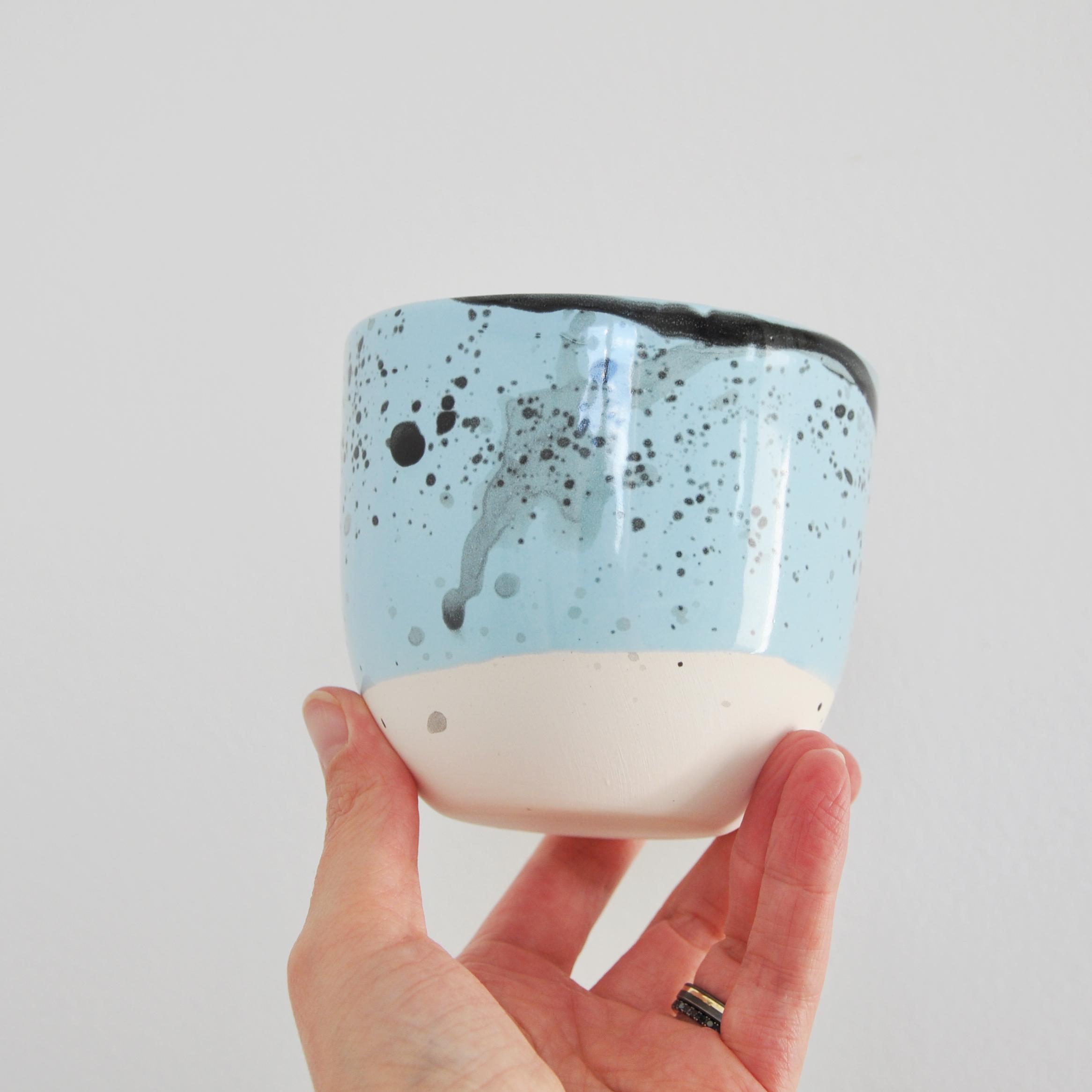 Handmade Light Blue Ceramic Planter with Black Splashes – Small Pot for Succulents, Cacti, or Air Plants