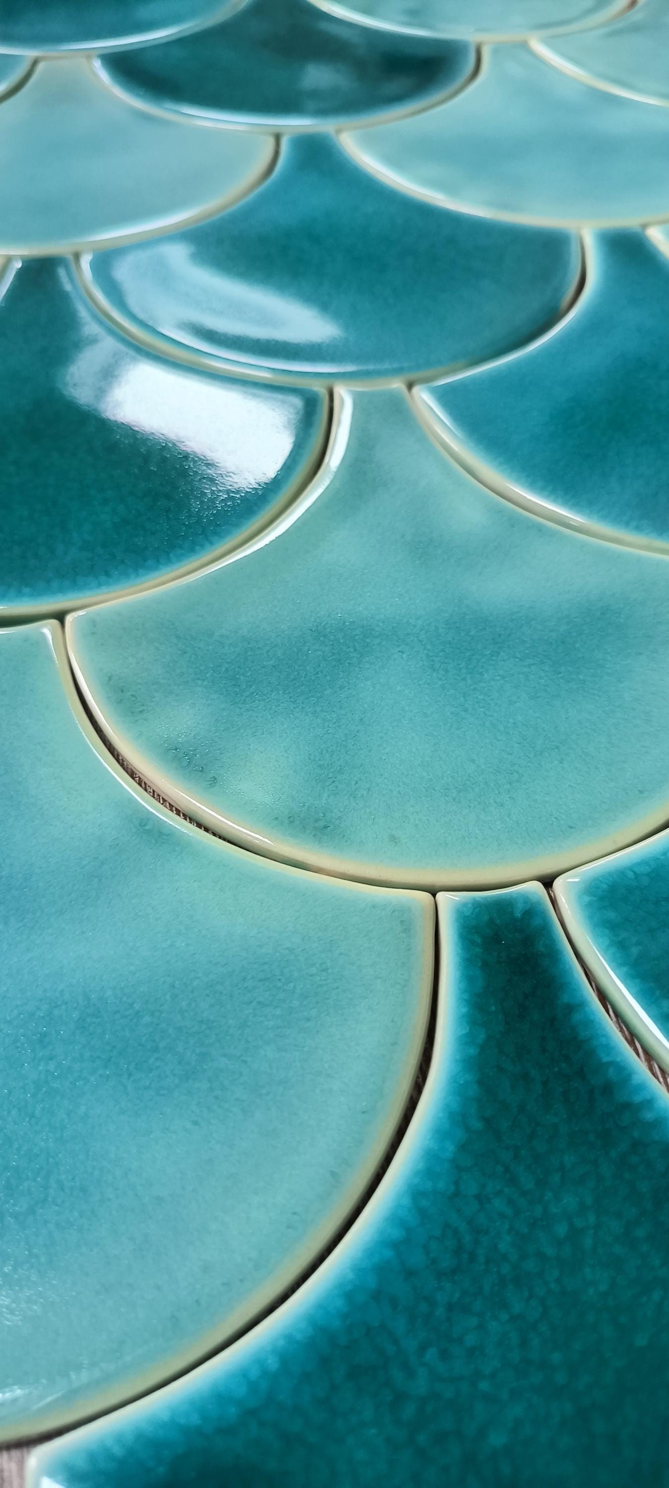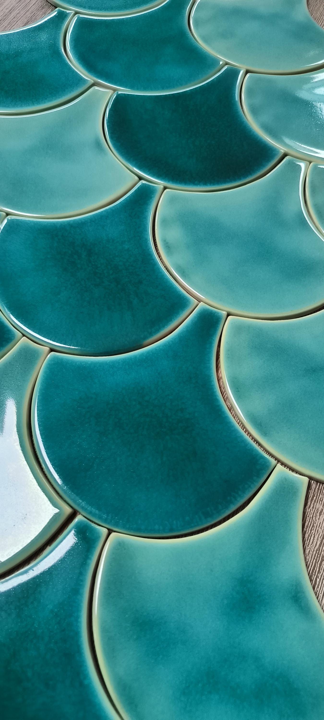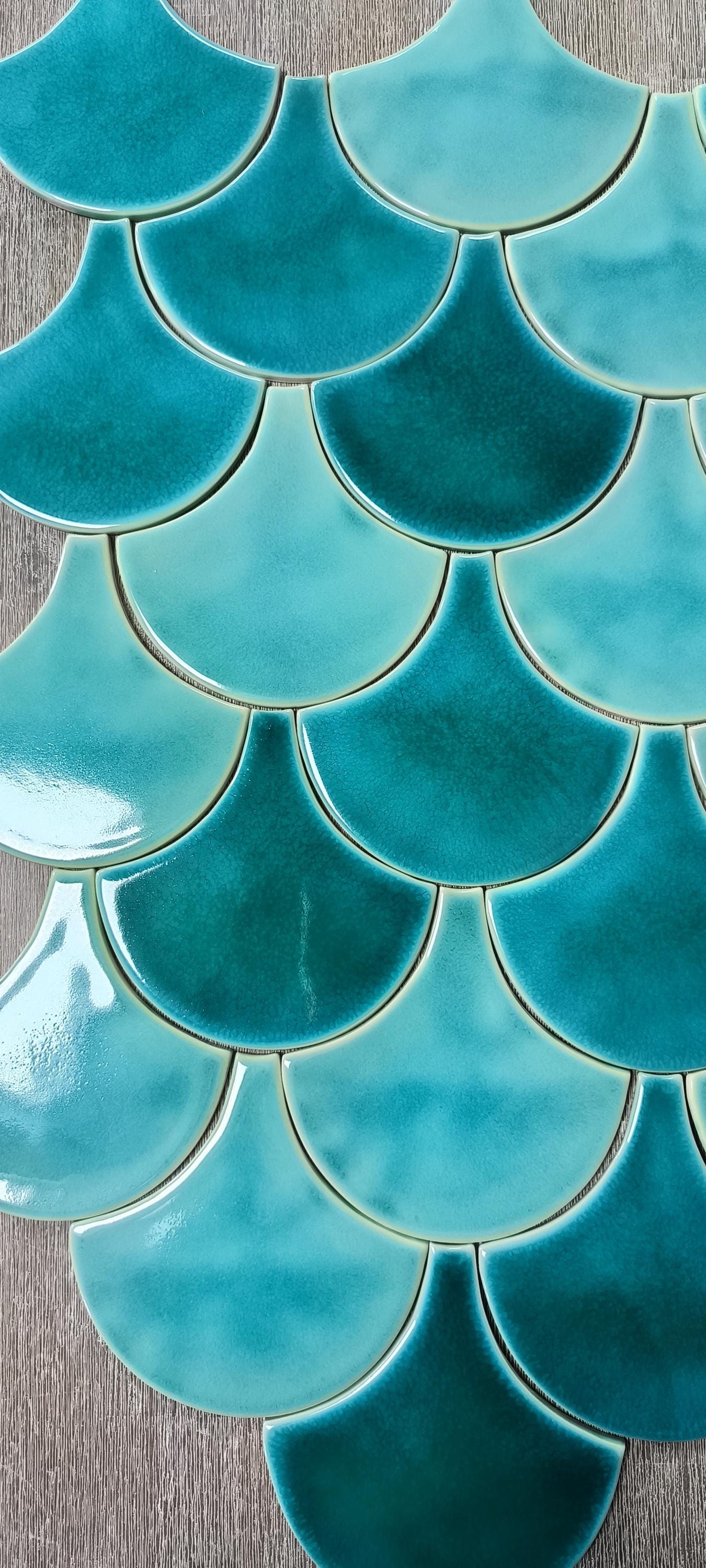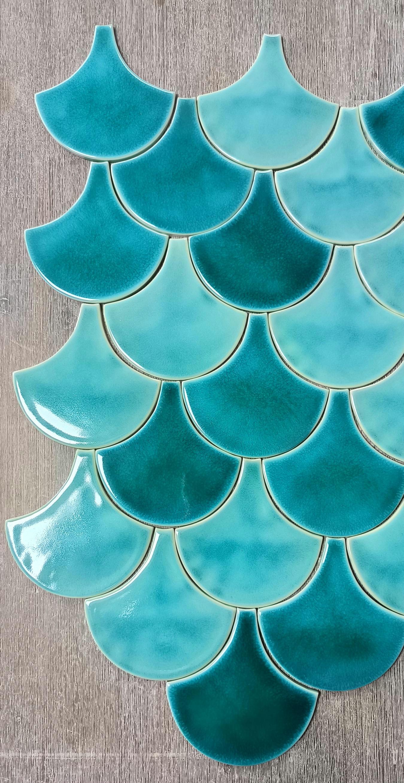 Transform your interior with the soothing hues and flowing form of turquoise fish scale tiles, where handmade artistry meets timeless design. 💧