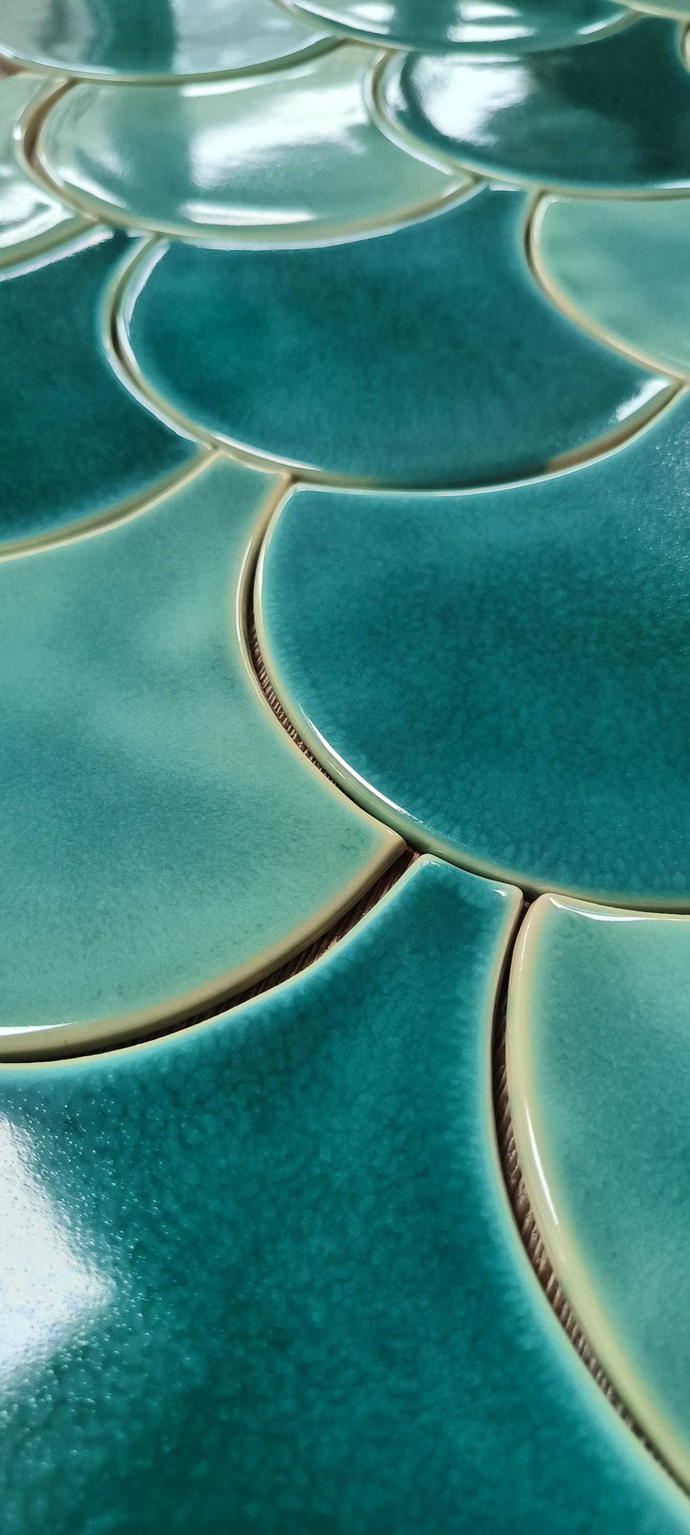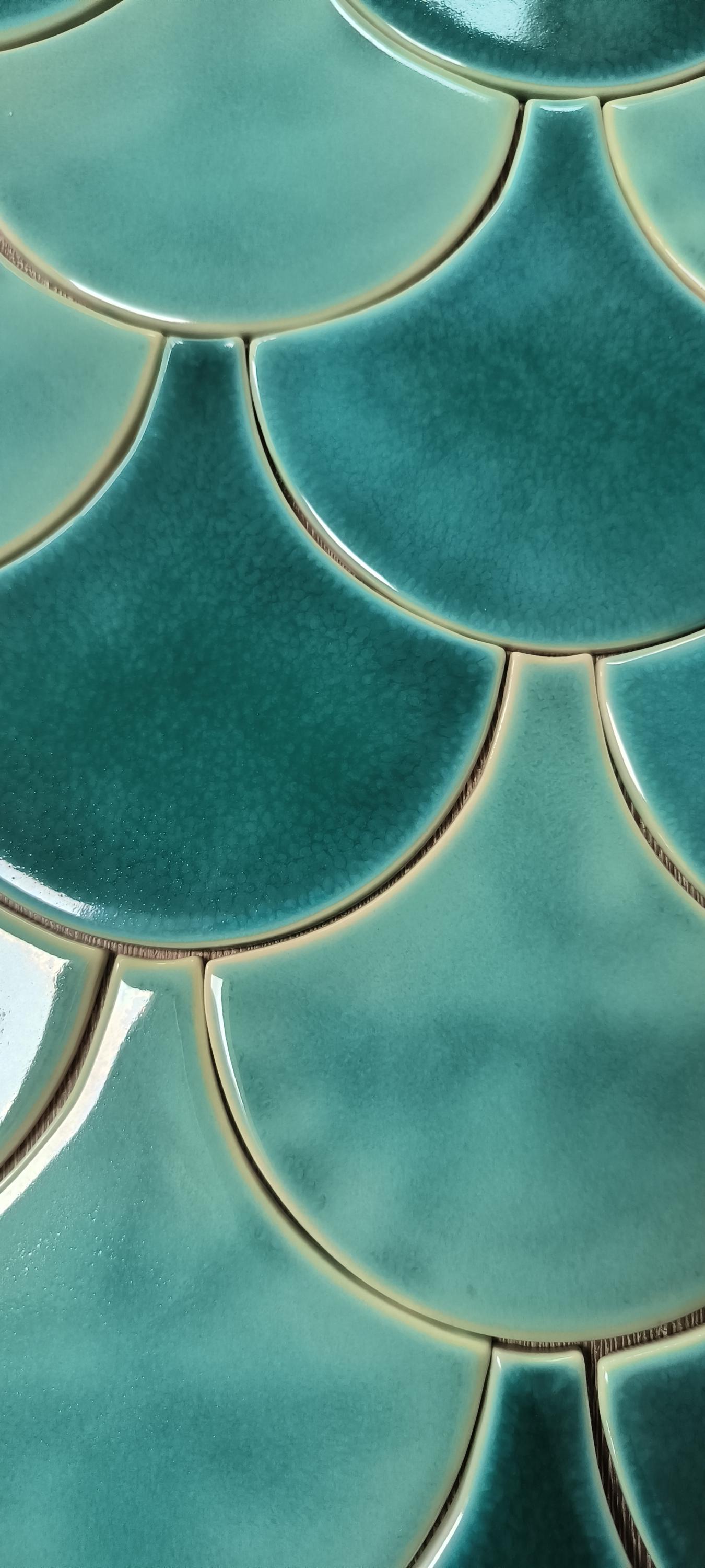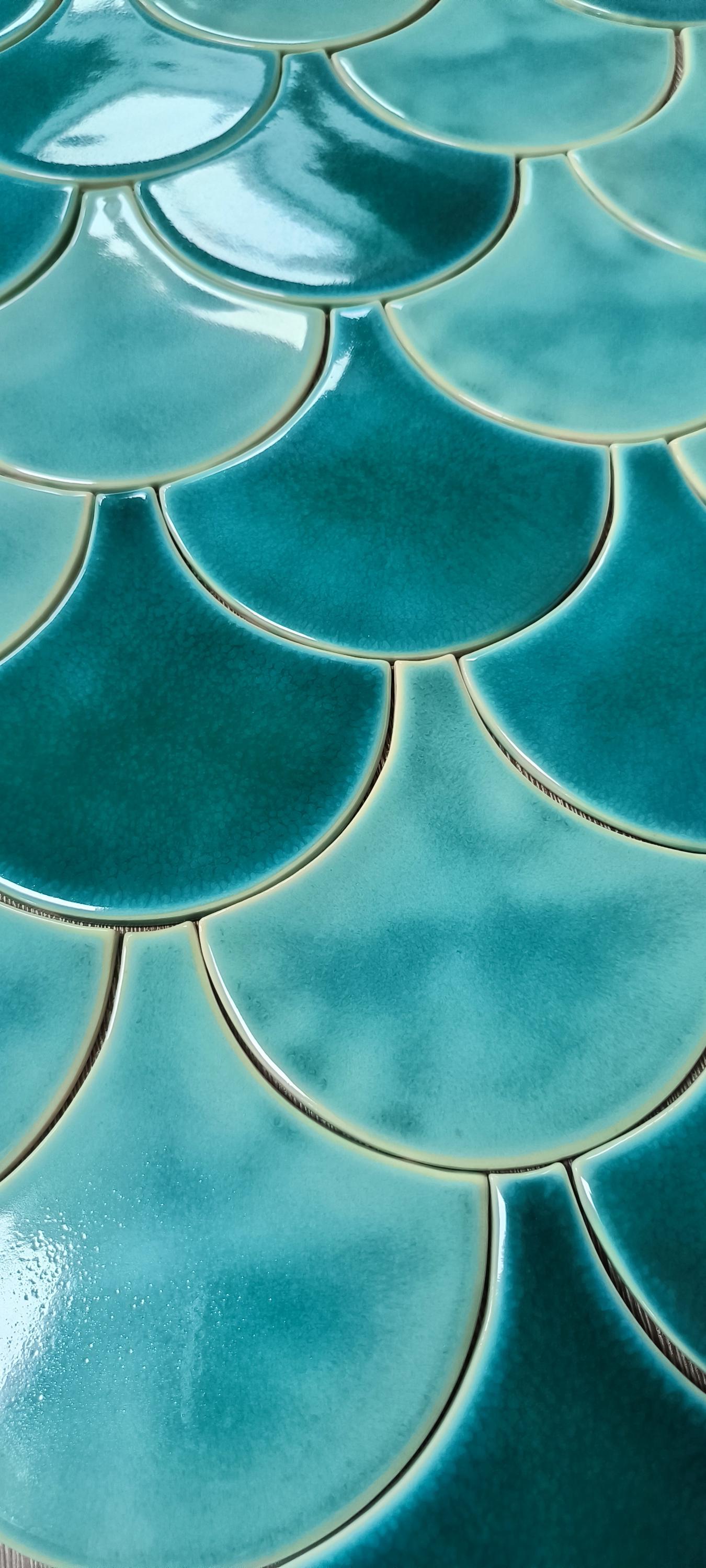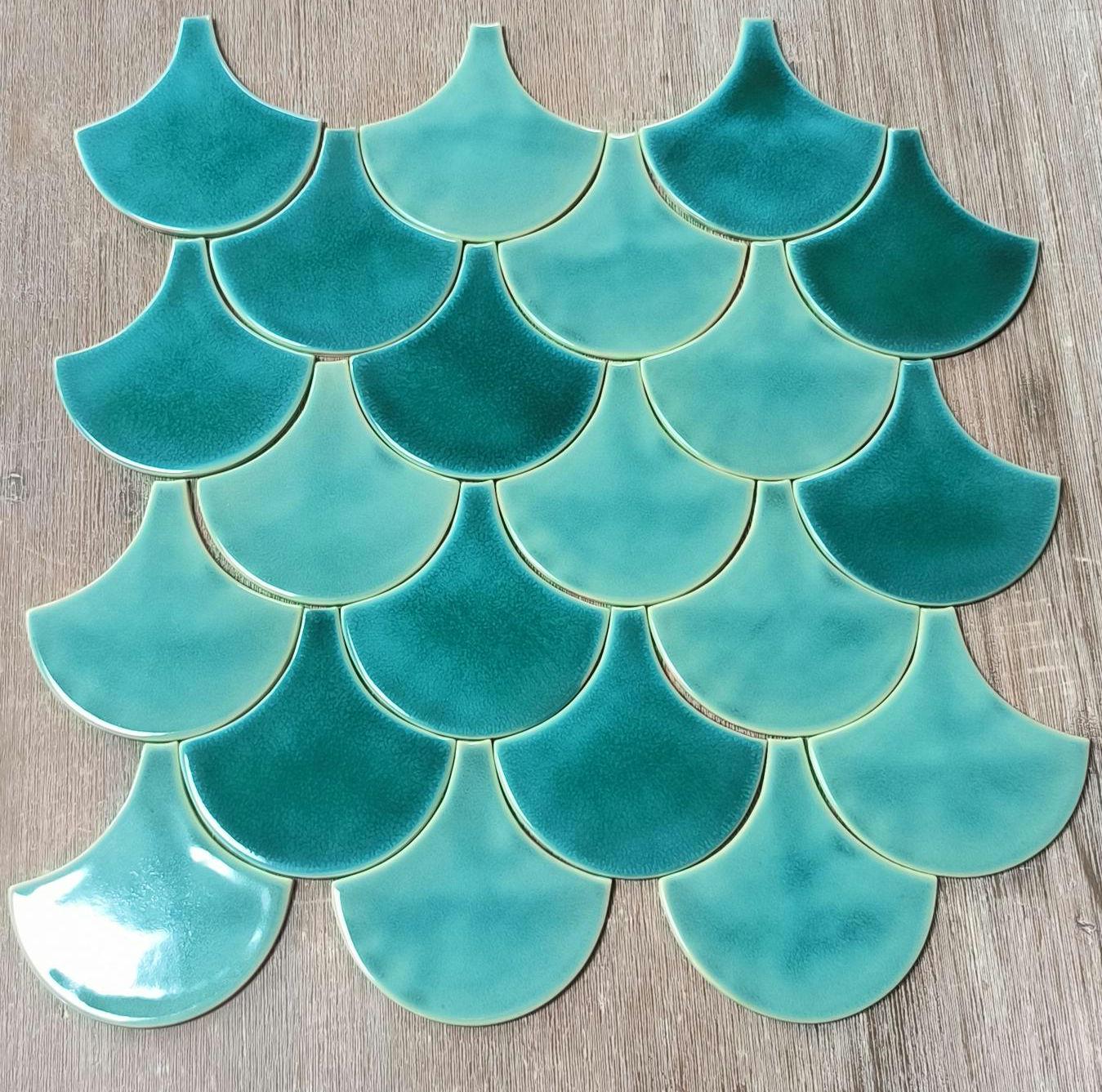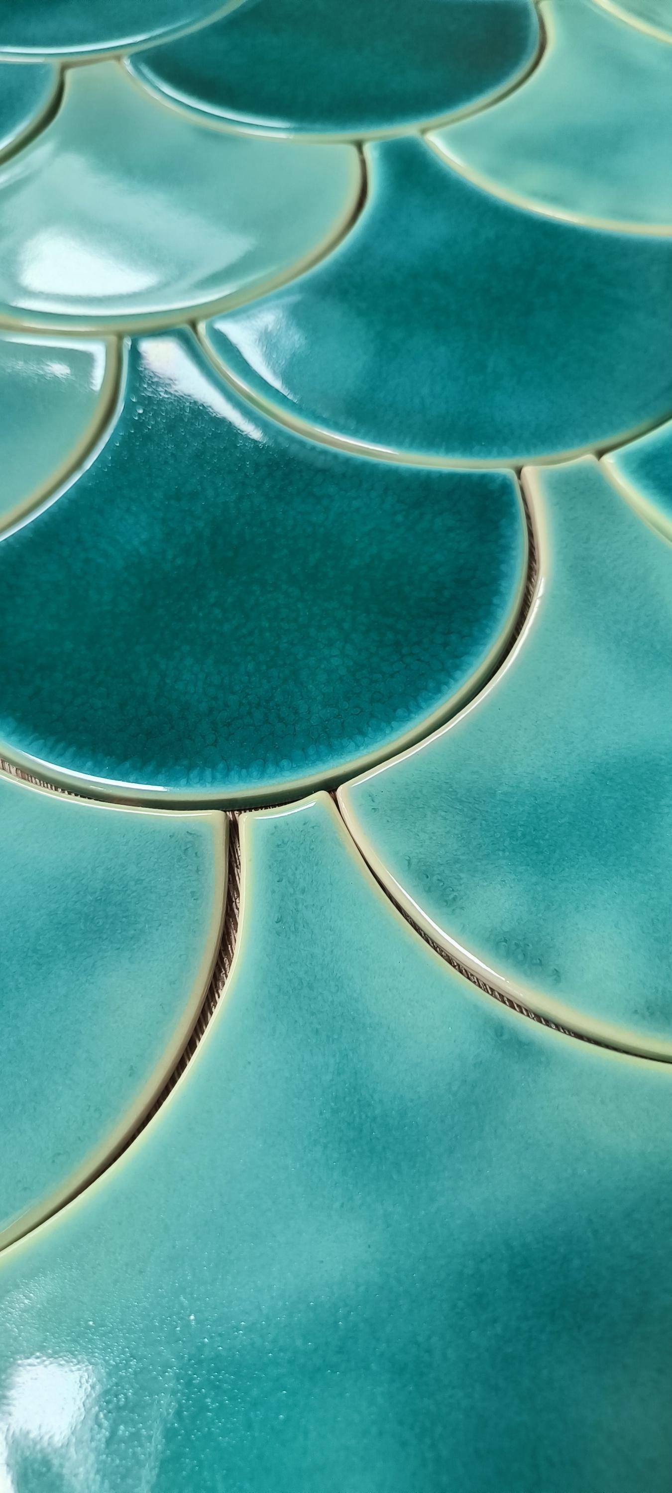 Transform your interior with the soothing hues and flowing form of turquoise fish scale tiles, where handmade artistry meets timeless design. 💧